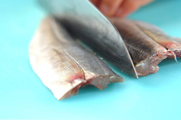 アジは頭と尾を切り落とし、縦半分に切ってゼイゴを取る。
