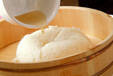固く絞った布巾で飯台を拭き、炊きたてのご飯をあけ、<合わせ酢>をかけ、1分そのまま置く。しゃもじで切るように手早く混ぜ合わせて飯台に広げ、ウチワであおいで急激に冷ます。乾かないように、固く絞った布巾をかぶせておく。