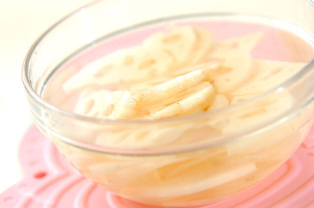 レンコンは皮をむいて幅5mmの輪切りにし、酢水に放つ(レンコンが大きい場合は、幅5mmの半月切りにする)。