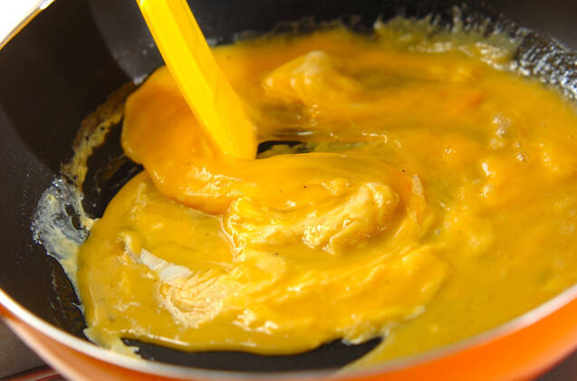 (1)のフライパンをサッと洗い、バターを入れて中火にかけ、混ぜ合わせた<卵液>を流し入れる。大きくゴムベラ等でかき混ぜ、お好みのかたさになったら(1)のご飯の上にのせ、ドライパセリを振る。