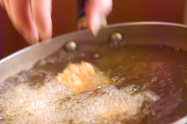 豆腐を4~6等分に切り、小麦粉を薄くつけ、小麦粉と水を混ぜ合わせた衣に通し、砕いたカキの種をつけ、170℃に予熱した揚げ油でサクッと香ばしく揚げる。
