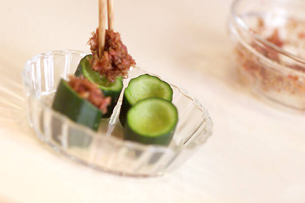 <おかか梅キュウリの作り方>キュウリは4等分に切る。梅干しは種を取って細かく刻み、かつお節、酒と混ぜ合わせる。少しくり抜いたキュウリの切り口におかか梅をのせる。