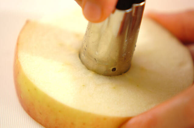 リンゴの中央にある芯を抜き型や包丁で切り落とし、水気を拭き取る。リンゴ2枚の間に<アーモンドクリーム>をはさむ。