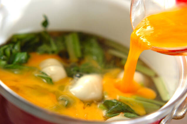 青菜がしんなりしたら、溶き卵をまわし入れる。軽く混ぜ合わせ、半熟になったら火を止める。器によそい、粉山椒を振る。