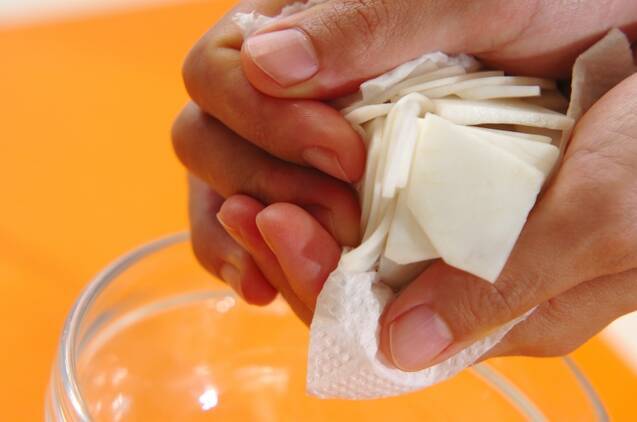 カブは葉を切り落として皮を厚めにむき、縦半分に切って横に薄切りにし、塩をからめて、少ししんなりしたら水気を絞る。