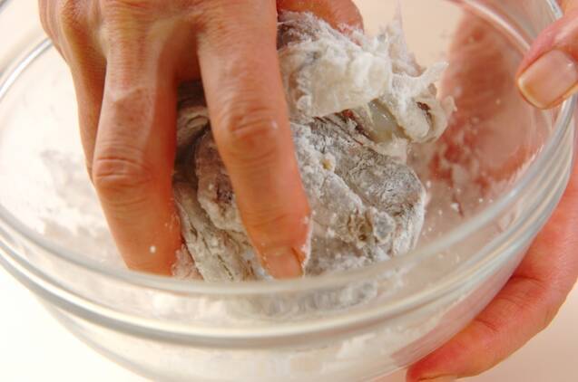 エビは殻をむいて背側に切り込みを入れ、背ワタを取る。分量外の片栗粉を加えてもみ込み、汚れを取り除いて水洗いし、水気を拭き取る。