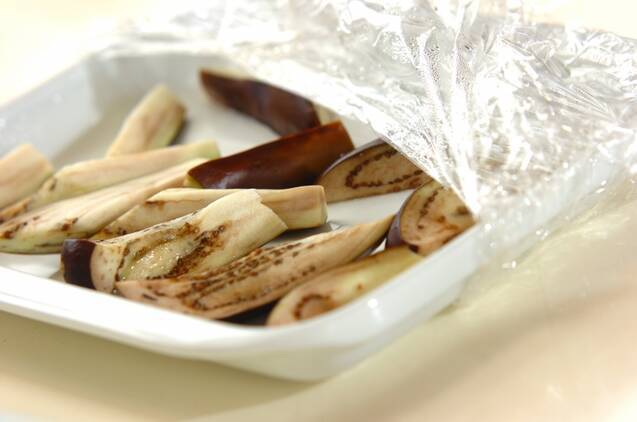 ナスはヘタを切り落として縦4~6つに切り、さらに斜め半分に切って水に放ち、ザルに上げる。耐熱容器にぬれたまま並べ、ラップをふんわりかける。電子レンジで加熱し、少ししんなりさせておく。