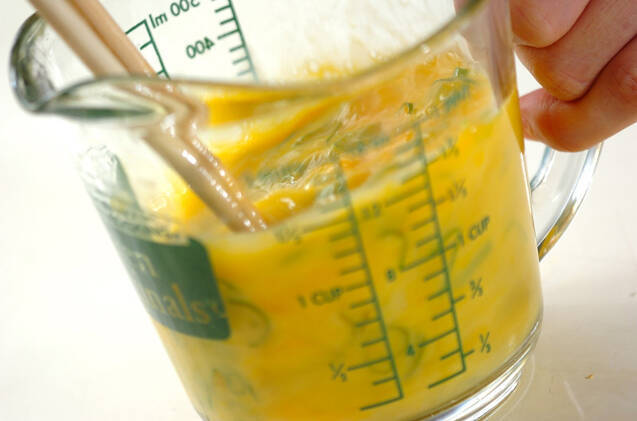卵は割ってサッとほぐし、刻みネギ、<調味料>を混ぜ合わせる。