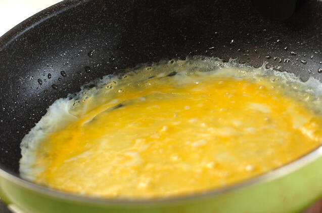 卵を1個ずつ溶きほぐし、片栗粉を小さじ1/2ずつ加えて混ぜる。フライパンにサラダ油を薄くひいて熱し、薄焼き卵を作る(残りも同様に焼く)。