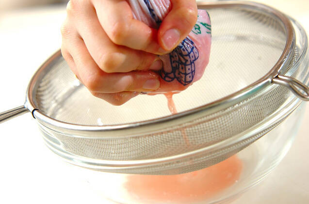 固く絞ったぬれ布巾にスイカを適量のせ、ギュッと搾る。グラスに注ぎ、お好みで炭酸水や白ワインを注ぐ。(ヒント)お好みで分量外のシロップ等を加え、甘さを調節して下さい。