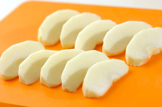 <リンゴのソテー>を作る。リンゴは皮をむき、芯を取り除き、10等分にカットする。