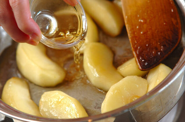 鍋に無塩バター10gを入れて火にかけ、溶けたらリンゴを加える。無塩バターが全体にからまったら、グラニュー糖12gを加え、リンゴが透明になり、しんなりするまで炒める。レモン汁、カルバドス酒を加え、アルコールを飛ばす。