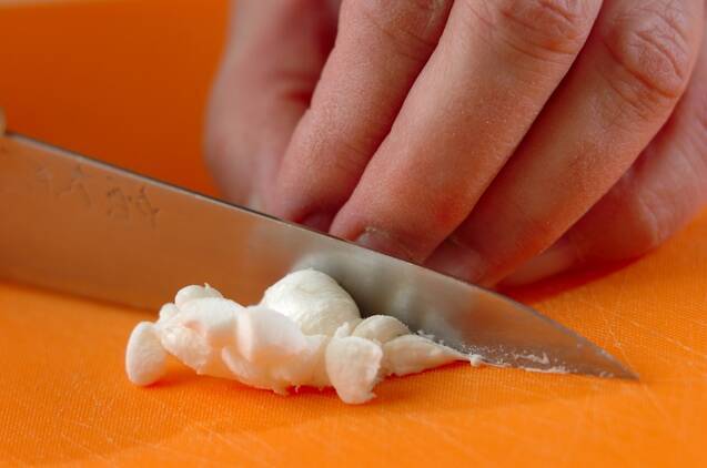 マシュマロは5mm角に切る。<ソース>の材料を混ぜ合わせる。