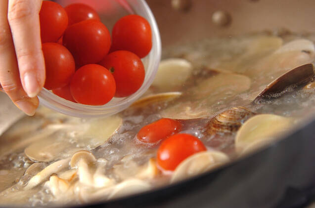 ハマグリの殻が開いたら水を入れ、煮たったらプチトマト、コショウ、固形スープの素はくずしながら入れてひと煮立ちさせる。