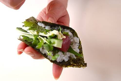 焼きのりやサニーレタスにご飯を薄くのせ、好みの具をのせて巻き、練りワサビ、マヨネーズ、白ゴマ、しょうゆなど、好みの調味料をつけていただく。