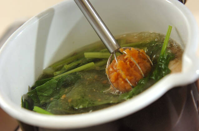 煮たつ直前にみそを溶き入れて火を止め、器によそう。