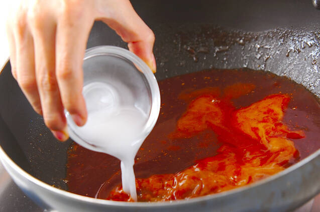 中華鍋に<甘酢あん>の材料を混ぜ合わせて中火にかけ、煮立ったら、<水溶き片栗>を加える。