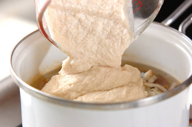 (1)の鍋に板コンニャク、ちくわ、(2)の酒粕をだし汁ごと加えて酒粕が煮溶けるまで煮る。