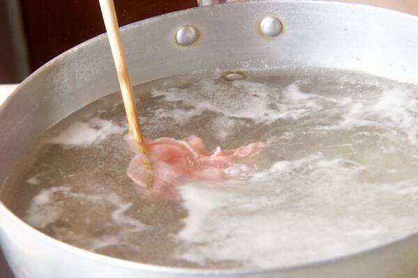 豚薄切り肉は、酒、塩を加えた熱湯に、菜ばしで豚肉を1枚ずつ泳がせ、豚肉の色が変われば冷水に取り、冷たくなればザルに上げて水気を切る。