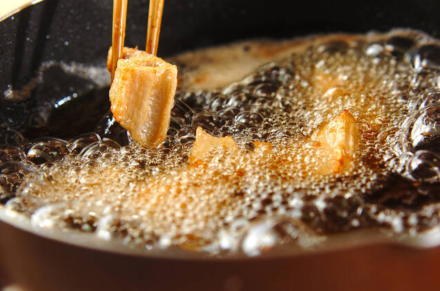 170℃の揚げ油にレンコンを入れ、表面に薄く揚げ色がつくまで揚げ、油をきる。続けてナスも同様に揚げる。