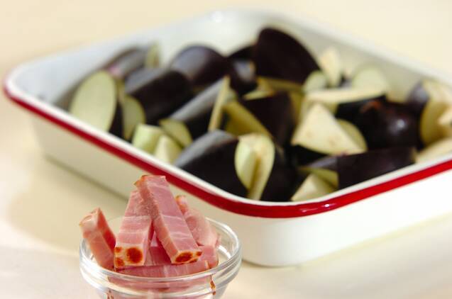 ナスはひとくち大の乱切りに、ベーコンは1cm角の拍子木切りにする。