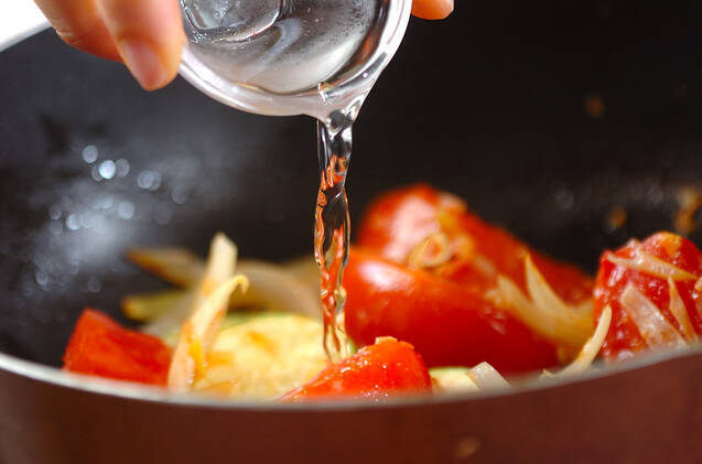 フライパンにニンニクとオリーブ油を入れて中火にかけ、香りがたったら(1)の野菜を加えて炒め合わせ、全体に油がまわったら白ワインを加え、塩を振る。フライパンに蓋をし、弱火で3分蒸し煮にする。