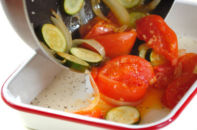 全体がしんなりしたらフライパンの蓋を外し、蒸し汁が多ければ煮詰めて(1)の<マリネ液>に移す。粗熱が取れたら冷蔵庫で冷やし、器に盛る。(ヒント)調理時間に冷やす時間は含みません。