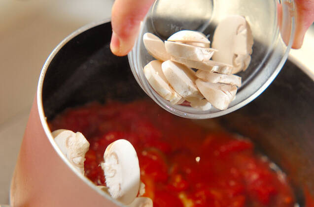 フライパンにバターを熱し、シメジを炒める。しんなりしたら小麦粉を振り入れ、粉っぽさがなくなるまで炒める。塩コショウをして(5)の鍋に加え、マッシュルームも加える。