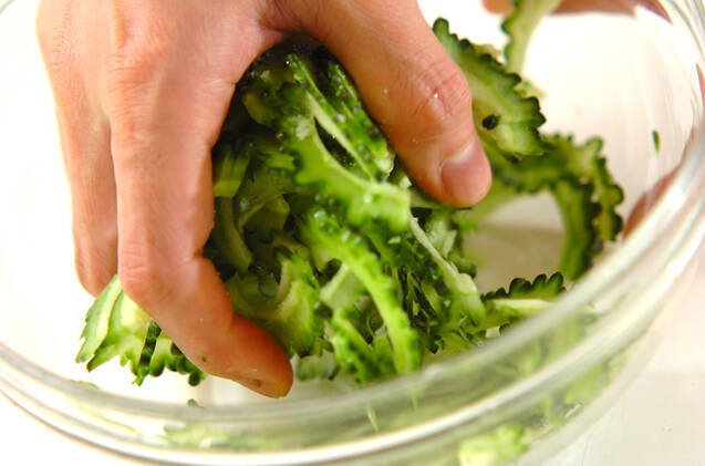 ゴーヤは種とワタを取り除き、薄切りにする。分量外の塩を加えてもみ込み、水気がでてきたらしっかり絞る。