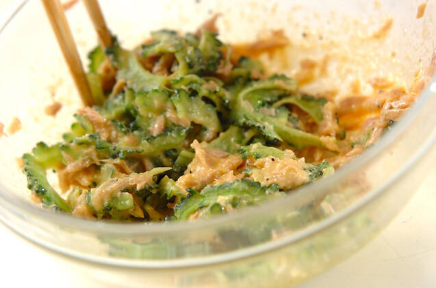 ボウルに<卵液>の材料を混ぜ合わせ、(1)のゴーヤ、油をきったツナを加えて和える。
