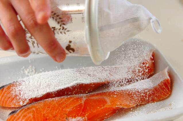 サーモンの両面に塩コショウを少し多めに振り、薄く小麦粉をまぶす。