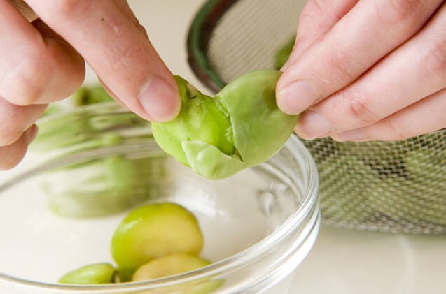 そら豆はサヤから取り出し、塩を入れた熱湯に入れ、煮立てば2分ゆでる。ザルに上げ、粗熱が取れれば薄皮をむき、ザク切りにする。水煮タケノコは刻んだそら豆位の大きさに刻み、熱湯をかけて臭みを抜く。しっかり水気をきる。