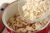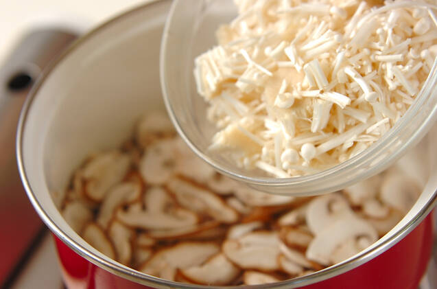 鍋に水200mlを煮立たせ、白ワインとマッシュルーム、シイタケ、エノキ、玉ネギを加えて中火にかける。