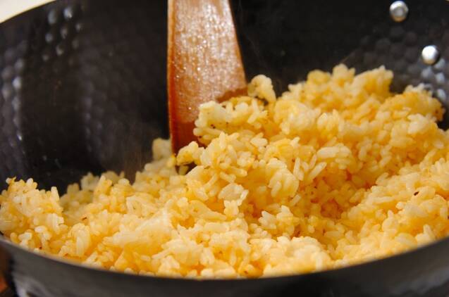 <小松菜あんかけチャーハン>を作る。フライパンにサラダ油を強火で熱し、卵を混ぜ合わせたご飯を入れ、パラパラになるまで炒め合わせる。