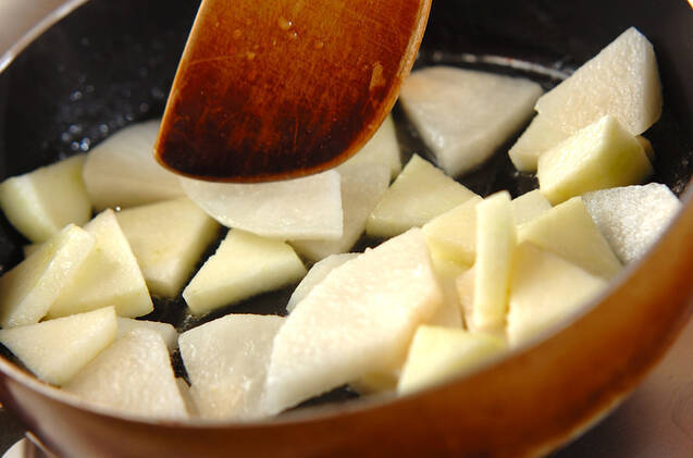 フライパンにバターを溶かし、砂糖と(1)を加えて柔らかくなるまで炒める。