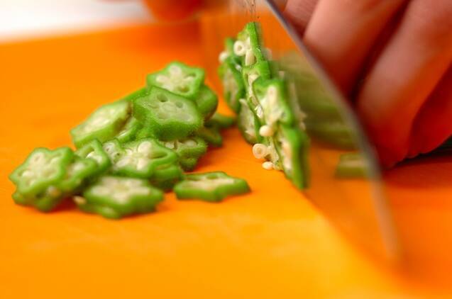 オクラはまな板に置き、塩をかけて手のひらで転がしながら繊毛を取り、熱湯に塩ごと加え、色が鮮やかになったら水に取る。粗熱が取れたら水気をきり、ヘタを切り落として薄い輪切りにする。