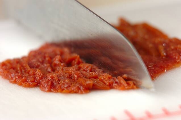 長芋は皮をむき、1cm角に切る。<梅肉ダレ>の梅干しは種を取り除き、ペースト状にたたく。その他の材料と混ぜ合わせる。