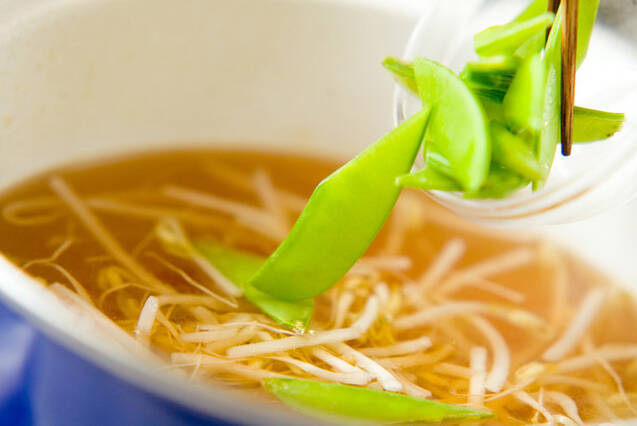 鍋に<スープ>の材料を入れて強火にかけ、固形チキンスープの素が煮溶けたらモヤシ、キヌサヤ、クコの実を加える。キヌサヤの色が鮮やかになったら火を止める。器に注ぎ分け、粗びき黒コショウを振る。