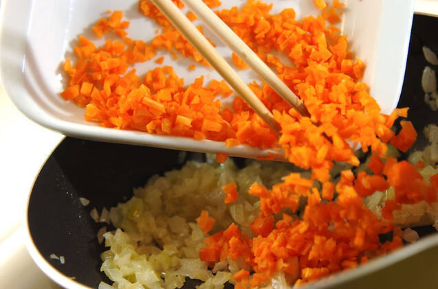 ニンジンを加え、全体に混ざるまで炒め合わせる。
