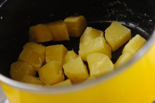 鍋に新しい水と(1)を入れ、柔らかくなるまでゆでる。柔らかくなったら湯をこぼし、塩を加えて強めの弱火にかけ、サツマイモを転がすように鍋を振り、水分を飛ばして冷ます。