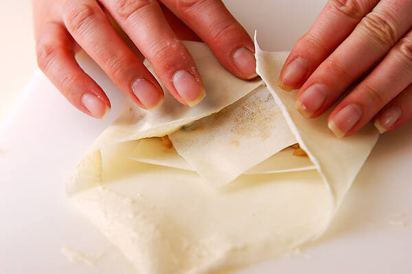 春巻きの皮は1枚だけ4等分に切る。切っていない春巻きの皮に4等分に切った春巻きの皮を中央にのせる。その上に2の具を1/4量のせ、手前の端を具にかぶせ左右を折り、クルクルと巻き、<小麦粉のり>でとめる。