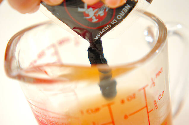 <スープ>の材料は合わせて、固形スープの素を煮溶かしておく。固形スープの素が溶けたらイカスミペーストと合わせておく。