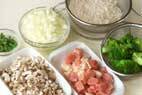 米は水洗いしてザルに上げる。玉ネギはみじん切りにする。鶏もも肉は1.5cm角に切る。シメジは石づきを切り落とし、刻む。サヤインゲンは軸側を少し切り落とし、塩を入れた熱湯でゆでて水にとり、粗熱が取れれば、1cmの長さに切る。ブロッコリーは小房に分け、熱湯でサッとゆで水に取り粗熱が取れれば水気を絞る。