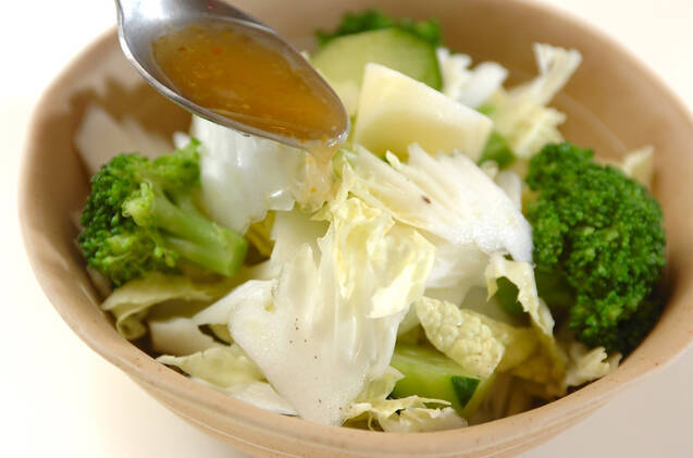リンゴ、白菜、ブロッコリー、キュウリをサッと混ぜ合わせて器に盛り、<ドレッシング>をかける。