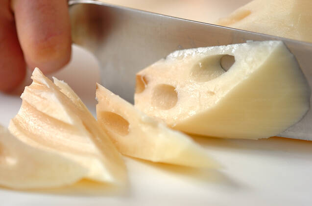 レンコンは皮をむいて斜め乱切りにして水に放つ。