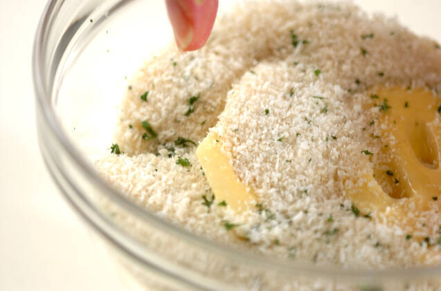 レンコンの水気をしっかり拭き取り、<合わせ衣>を通して<合わせパン粉>をつけ、揚げ油でサックリ揚げる。