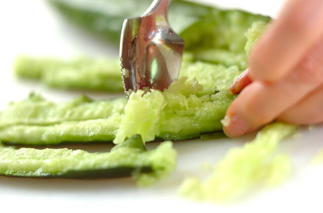 キュウリは両端を少し切り落とし、すりこ木でたたいて食べやすい大きさに分け、種を取り除く。小カブは葉を切り落とし、皮を厚めにむいて食べやすい大きさのくし切りにする。