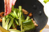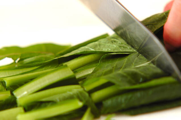 小松菜は根元を切り落として長さ3cmに切り、軸と葉に分ける。