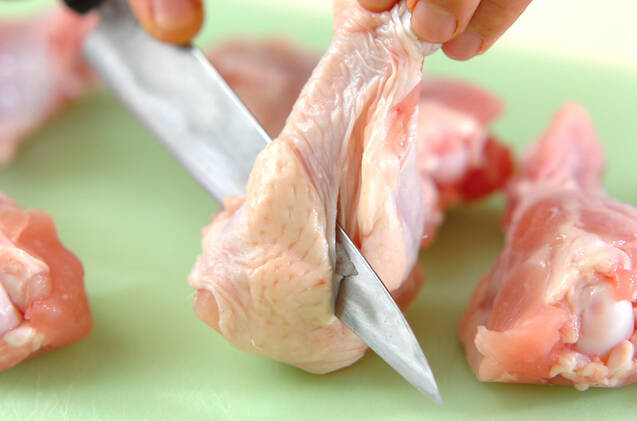 鶏手羽元は骨の際に切り込みを入れ、塩コショウをして小麦粉を薄くまぶす。
