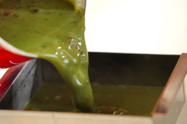 内側を水でぬらした流し型、またはバットに流し入れる。容器を冷水に重ねて粗熱が取れたら、冷蔵庫で冷やし固める(30~40分くらいで固まります)。食べやすい大きさに切って器に盛り、フルーツを添える。(ヒント)今回は洋梨を使っています。